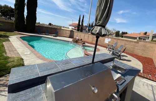 It's nice to arrive to a welcoming and quiet place with comfy rooms. Maybe watch a show on tv or go outside in the spa or sit on the baja pad in the pool. It's perfect for those hot summer days and those beautiful summer nights. The built-in BBQ is a hit for the easiest dinners. And if you don't feel like cooking its only minutes away from The Blvd where you can walk around and choose from all the delicious places to eat or stop by the Lancaster Performing Art Center for a show. Don't miss the Farmer's Market it is every Thursday where you can find fresh produce and the best ice-cream. This house is only minutes from AVMC and Northrup for all our Travelers. Discounts for monthly short term renters. Thank you for choosing our house to make your stay memorable.