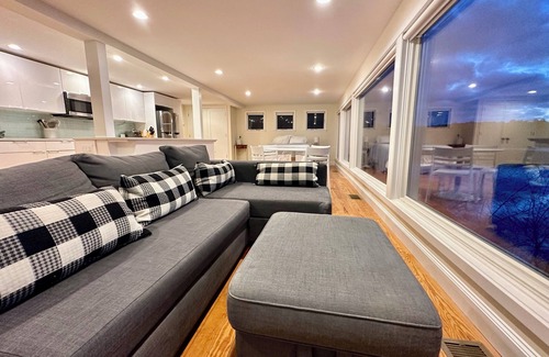 Guests love this stylish and open cottage located on the shore of a large, recreational lake. It's like being on your own luxury houseboat! Wall-to-wall windows with panoramic views, private beach, new modern kitchen, luxurious King gel/coil bed, private office space, large bathroom with curved shower, and much more!