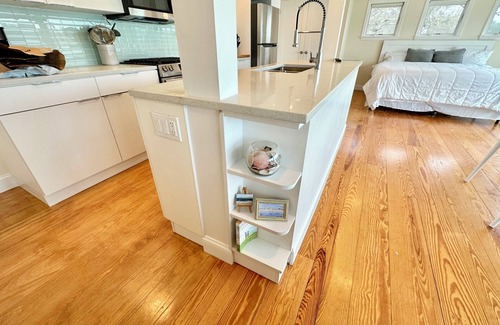 Formerly a charming boat house, this completely renovated and modernized retreat features dramatically huge wall-to-wall and floor-to-ceiling windows facing the lake, a brand new kitchen with a 5-burner gas stove and gorgeous quartz countertop countertops, and a large bathroom with a dramatically curved tile and glass shower.