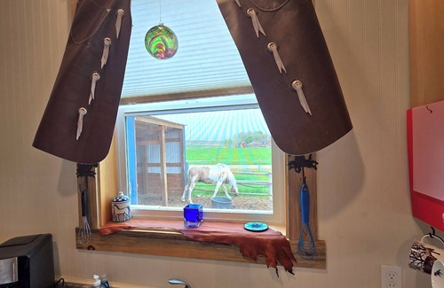 Walking in, you'll notice the comfortable recliners in the living room- one is a lift recliner for anyone needing an extra boost. A smart TV allows you to watch your favorite shows. The kitchen is a great place to prepare a meal and have a cup of coffee around the island. The queen bed feels like sleeping on a cloud with a luxury foam topper. You'll notice the unique western décor throughout the home! The bathroom has a step in shower. Outside, you'll have your own patio space with one of the most unique outdoor tables and gas grill for easy summer meals. Wrangler's Hideout is located with another private vacation home, Heart Strings Ranch, so larger groups can rent both!