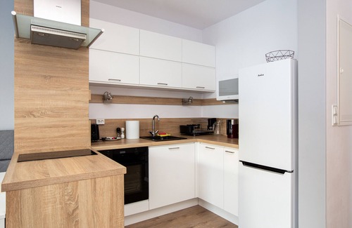 Wrzeszcz Modern Studio features a stylishly designed living room with a king size bed, a kitchenette, a bathroom, and a spacious terrace where guests can relax and enjoy their morning coffee or an evening glass of wine. Guests have at their disposal a range of practical amenities, including a TV with MAX app, washing machine, iron, hairdryer, fridge with a freezer, oven, microwave, toaster, and kitchen accessories.