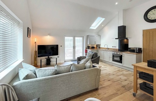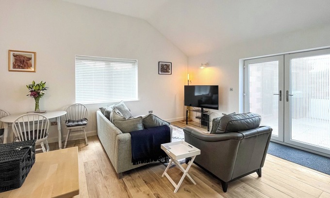 Upon entering, guests are greeted by a spacious open-plan living, dining, and kitchen area, bathed in natural light and adorned with tasteful décor and quality furnishings. The kitchen is fully equipped with modern amenities, ensuring convenience and comfort throughout your stay. Whether whipping up a hearty breakfast or preparing a leisurely dinner, this space caters to all culinary desires. The accommodation features a generously sized bedroom, furnished with a sumptuous king-size bed and an additional single bed, ideal for accommodating the little ones. The sleek and contemporary bathroom provides a serene environment for relaxation and rejuvenation after a day of exploration.