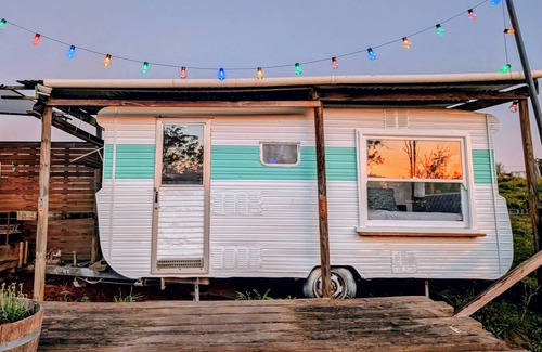 A cute caravan with a beautiful view and a lovely creek. There's a queen bed and dining table in the caravan and an outdoor kitchen/bathroom with a portable toilet. This rustic accommodation would suit those who like camping but don't want the hassle of setting up a tent.