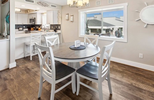 As you enter the main level, you'll be greeted by a quintessential beachy ambiance. We're talking clean, neutral walls with light blue furniture and decor and large windows that allow the coastal rays to shine in, instantly reminding you why you choose this incredible home and location! The Kitchen boasts brilliant white cabinets that match the vivid walls and modern, stainless steel appliances for preparing succulent seafood dishes. The Dining Area has a round table with seating for 4. The Living Area holds a sleep sofa and loveseat with matching nautical blue stripe patterns where you can relax around the Electric Fireplace after a day at the beach. Open the sliding glass doors in the living area and you'll be led to the covered deck overlooking the majestic Atlantic Ocean. There is a Full Hallway Bathroom with a shower/tub combo. One bedroom holds a queen bed and a twin bed with a Nectar mattress and the master has a king bed with a Nectar mattress and an ensuite bathroom.