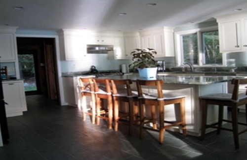 lake side home on East shore of Thompson Lake. This is an exceptionally comfortable and well appointed house that gracefully accommodates a large group. Wooded and private on private island with year round road access. Gourmet kitchen, game room with pool table and ping pong. Spa room with hot tub and sauna. Sun room, den/TV room, large living with gas fireplace and dinning room, large deck with outdoor seating and lounge chairs. Great dock with seating and swim ladder. Gradual sandy entrance to water. All located on private water front with beach. Water views from most rooms. Beautiful sunsets. Close to down hill and X country skiing. Many extras including, fire pit, kayaks, stand up paddle boards, canoe, washer and dryer, gas grill, WiFi and outdoor furniture. Great get away in all seasons. The house sleeps 10 people but discounts given for small groups.