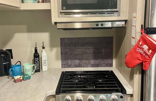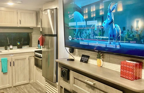 Inside of the RV, you have a queen bed that sleeps two. The full bathroom with Shampoo, conditioner, bath gel, razor, bar soap, and the kitchen is fully stocked. We provide oil, vinegar, salt, pepper, garlic powder, tea, sugar, and coffee. There is a smart TV with free Netflix and wifi.