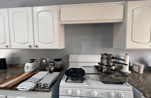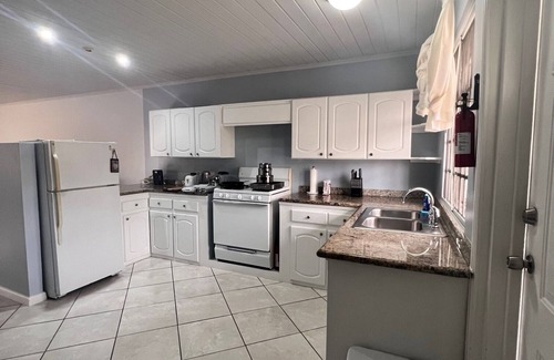 The villa is laid back and comforting. The living/dining room is complete with a smart TV, Amazon Fire & Free Wi-Fi . This room enjoys a lovely ocean breeze when the french windows and doors are opened. The front door leads to a shared pool surrounded by lounge chairs and tables and a perfectly manicured garden. Air conditioning is available throughout the apartment. There is a well equipped kitchen with granite counters, a grill well suited for barbecues with barbecue utensils, a wash room with a washing machine & a small powder room.