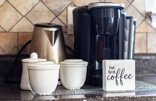 -The kitchen is perfect for long stays, with an island & stools, a seated desk area, a Coffee Station, 4 slice toaster, crockpot, microwave & more.