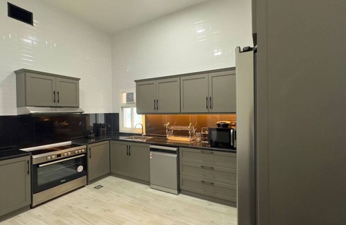 Discover unmatched luxury in this expansive 4,197 sqft villa, thoughtfully designed for both comfort and elegance. Upon entering, you'll find a sleek bathroom to your right, leading to a fully equipped kitchen complete with all the essentials to make you feel right at home.