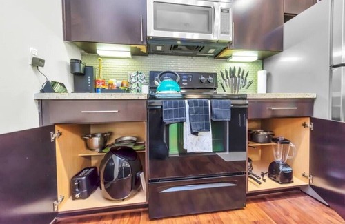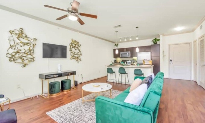 Relax and recharge in a luxurious 1 bedroom Emerald Luxury Escape. This modern abode is located in the heart of Houston. The location is unbeatable by just being minutes away from the medical center, NRG, and downtown! It's designed to give you an upscale yet comfortable experience. modern feel from the sleek furniture, remarkable amenities, to the cooking appliances. While this is your home away from home, please enjoy a complimentary welcome kit, spa essentials, smart and beauty hot tools.