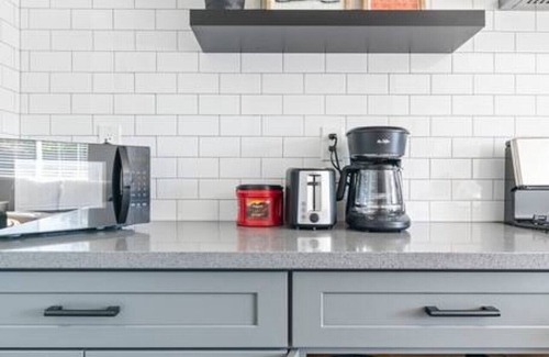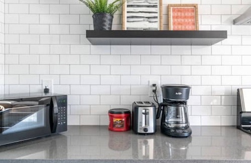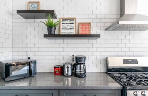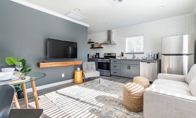 Cook dinner for two in a modern yet cozy kitchen, then dine at the romantic table as you share a glass of wine with your company to cap the night in this charming home. This peaceful residential space will surely be a home away from home.
