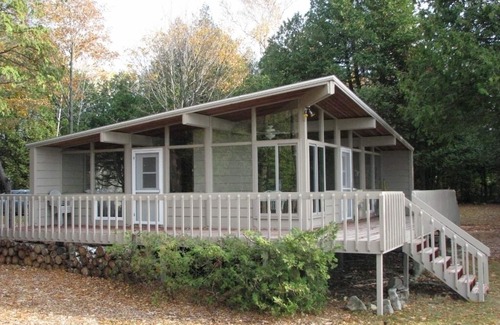 The cottage was inspired by the features of Frank Lloyd Wright and can accommodate a family of four. There is an extra charge over the first two. One bedroom has a queen size bed, the other bunk beds. The cottage has air conditioning but is mostly cooled from the breezes of Green Bay. There is a full kitchen and an outdoor grill. WiFi and cable TV and a wonderful fire pit., The dock is available for your use, whether it is for swimming or fishing. We need to assess conditions for installing the dock each spring..