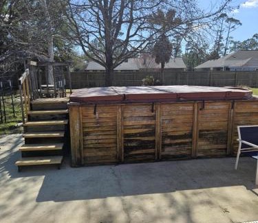 Food & DrinkTea/Coffee makerBathroomPrivate bathroom, Toilet paper, Bathtub or shower, Bathtub, Shower, ToiletMedia & TechnologyTV, Mobile hotspot device, Flat-screen TVGeneralHardwood or parquet floors, Air conditioning, Private entrance, Heating, Fan, Trash cansActivitiesHot tubKitchenStovetop, Refrigerator, Kitchenware, Microwave, Kitchen, Dishwasher, Toaster, Washing machine, Oven, Cleaning products, Dining tableOutdoorsBarbecue, Patio, Outdoor furnitureLiving AreaFireplace, Dining area, SofaBedroomWardrobe or closetRoom AmenitiesSocket near the bed |