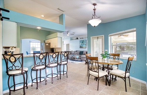 For dining, there is a family dining table that seats six and a breakfast table for four, both providing lovely views of the pool and canal. The family/game room is a versatile space for entertainment and relaxation.