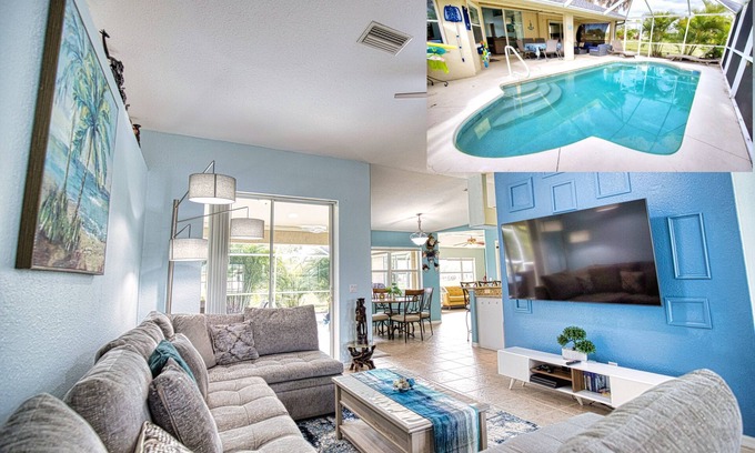 In the living room, a large smart 70" TV with cable channels and a comfortable, expandable sectional sofa create a perfect spot for movie nights and gatherings. Sliding glass doors extend the living space to the pool area, where you can enjoy the poolside lounge and outdoor dining area.