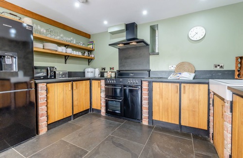 Kitchen and utilities – fully equipped, handcrafted kitchen with electric hob and oven, microwave, fridge freezer, dishwasher, and washing machine. Slate worktops and ceramic sinks.