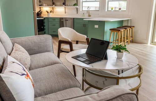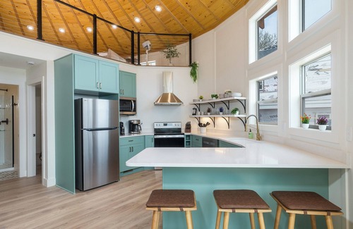 Step into a sun-drenched great room with floor-to-ceiling windows that frame the majestic Shenandoah landscape like living artwork. Our thoughtfully designed space embodies Nordic minimalism without sacrificing comfort—fully equipped kitchen, premium memory foam mattresses, and tasteful, modern furnishings throughout.