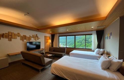 BathroomToilet paper, Shampoo, Body soap, Shower cap, Slippers, Bidet, Conditioner, Toothbrush, Hairdryer, Bathrobe, Toilet, Private bathroom, Free toiletries, Bathtub or shower, Towels, Shower, BathtubGeneralAir conditioning, Key access, Heating, Trash cans, SafeMedia & TechnologyTelephone, TV, Flat-screen TVKitchenRefrigerator, Electric kettleLiving AreaDesk, SofaViewRiver view, Mountain view, ViewServicesWake-up serviceAccessibilityAccessible by elevator, Upper floors accessible by elevatorRoom AmenitiesFeather pillow, Socket near the bed, Yukata, Drying rack for clothing, Clothes rackHot SpringOpen-air bath |