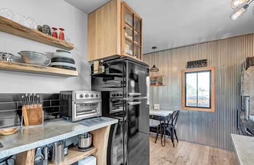 Cool vintage industrial style tiny house with state-of-the-art features and convenient downtown Davis location (next door to Tiny Peace of Zen). Raised two-level tiny house built on innovative Diamond Foundation Piers that emulate tree roots and provide a covered outdoor living space underneath. First floor includes a pass-through bar, convection/air fryer and induction cooktop, concrete countertops with live edge shelving, retro style refrigerator and vintage enamel dining table. Full size tiled bathroom with walk-in rain shower, radiant heat flooring, minimalist toilet, concrete floors and live edge sink. Hair dryer included. Living space includes flip-out sofa bed, A/C, reading nook, pallet wood fireplace/TV wall, and a small closet. Loft area (note: steep tiny house style stairs,made for active individuals) includes a queen size bed made from vintage wood and industrial style casters, lockers for storage, window bench, workout gear, small industrial style desk and access to the top floor deck. Enjoy beautiful views of the mountains while doing your sun salutations on the deck or enjoy a beautiful sunset while sipping some wine after a day of adventure! Large wrap around deck on the main level features a covered grilling area, pass through bar seating, and vintage theatre seats for enjoying the view. Outdoor area includes a firepit, small deck with gliding bench, gardens, fenced yard, and reading benches. Zen Too has a 2-car parking space and a boardwalk entrance lined with Quaking Aspens.