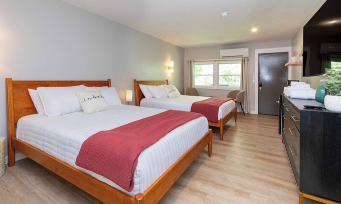 Escape to The Dogwood, a chic boutique hotel filled with modern amenities and style. This deluxe double Queen studio includes access to a Lounge with seating areas, full kitchen, 2 half-baths, patio, and gym with Peloton and treadmill. You may never want to leave, yet you're in the heart of Maggie Valley - full of character and things to do - with shops, restaurants, and craft beverages all near Great Smoky Mountains National Park, Tube World (0.5 miles) and Catalooche Ski Area (4.5 miles). This escape is ideal for families, couples, motorcycle tourists, and outdoor adventurers!